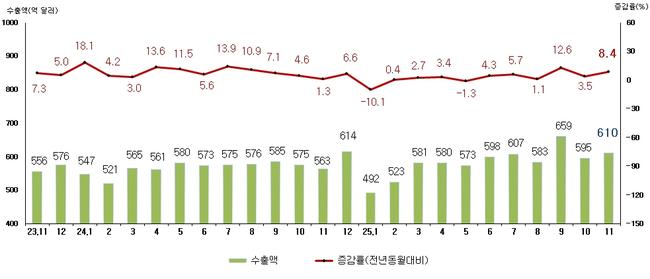 2025년 11월 우리나라 수출은 전년 동월 대비 8.4% 증가한 610억 달러로 6개월 연속 증가세를 이어갔고, 수입은 1.1% 늘어난 513억 달러를 기록하며 무역수지는 97억 달러 흑자를 나타냈다.