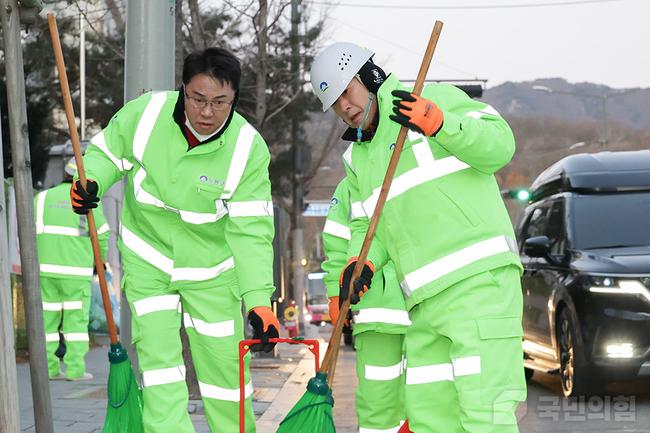 이날 장 대표는 영하 13도의 혹한 속에서도 오전 7시부터 김재섭·박성훈·서천호·신동욱·우재준·조지연 의원 등 당 지도부 및 소속 의원들과 함께 약 2km 구간의 거리를 청소했다. 형광 미화복과 헬멧 차림으로 낙엽을 쓸고 쓰레기봉투를 차량에 직접 싣는 등 1시간가량 현장 활동에 매진했다. 봉사 후에는 환경공무원들과 삼계탕 조찬을 함께하며 현장의 고충을 청취하고 이들의 노고를 격려했다.