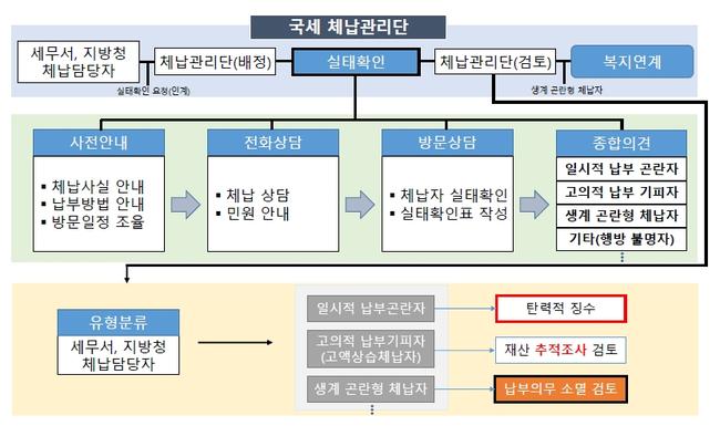 국세청은 모든 체납자를 직접 대면해 실제 납부능력과 생활실태를 확인하는 ‘맞춤형 체납관리 시스템’을 구축하기 위해 국세 체납관리단 운영을 준비해 왔다. 이를 위해 국세징수법을 개정해 체납자의 거소와 수입 등에 대한 실태확인 범위를 명확히 하고, 기간제 근로자가 해당 업무를 수행할 수 있는 법적 근거를 마련했다. 인건비와 건물 임차료 등 운영 예산 100억 원도 정부 예산안에 반영했다.