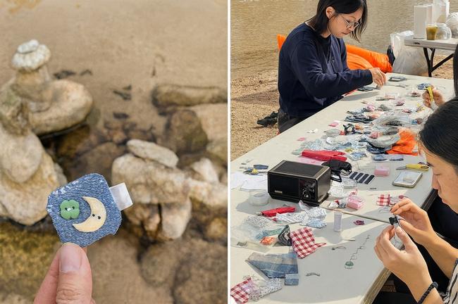 <2025 돌탑제> 현장. 참가자들이 돌탑을 쌓고, 천조각을 실로 엮어 브로치를 만드는 모습. 서로 다른 색과 무늬가 하나로 이어지며 `우리`의 의미를 더했다.